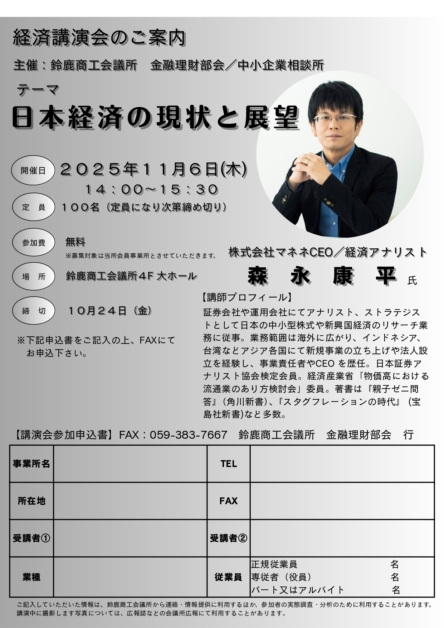 鈴鹿商工会議所 金融理財部会主催で経済講演会を開催します。