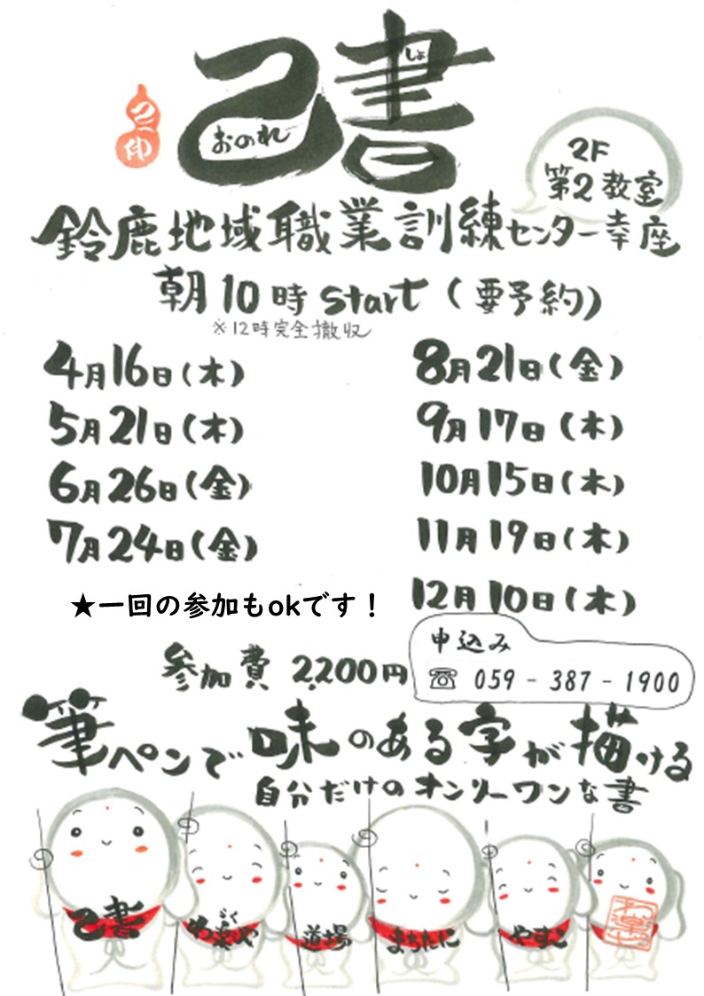 鈴鹿地域職業訓練センターより、ワークショップ「己書」開催のご案内です。詳細は下記をご確認ください。